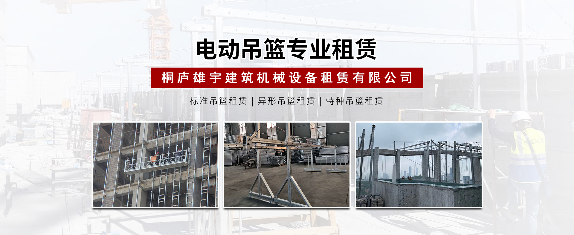 桐廬雄宇建筑機械設備租賃有限公司是一家專業從事吊籃租賃業務的公司,本公司擁有普通電動吊籃以及其他專用吊籃設備。公司自成立以來,承蒙業內同仁已經各界朋友的關愛與支持,始終秉承"以客戶為根本,以信譽求發展"的經營理念,堅持"精心管理,優質服務"的服務宗旨,多年以來...